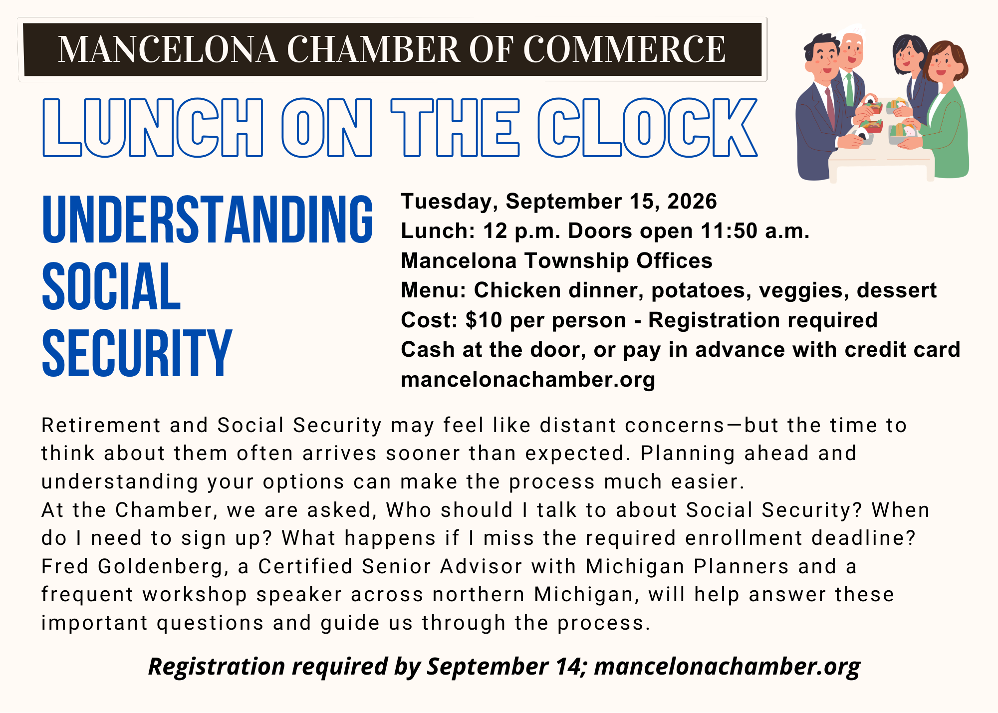 Do you know when to - and when not to - sign up for Social Security and/or Medicare? or where? Retirement and social security may feel like distant concerns, but the reality is - those days arrive sooner than expected. Planning ahead and understanding your options can make the process much less complicating. Fred Goldenberg is a Certified Senior Advisor with Michigan Planners, and a frequent workshop speaker across northern Michigan. He'll have the answers to these important questions and more, while touching on the future of healthcare, social security, and reviewing potential issues with them. Come hungry! Our lunch menu is the end-of-the-season fried chicken spread with all the sides, plus desserts.